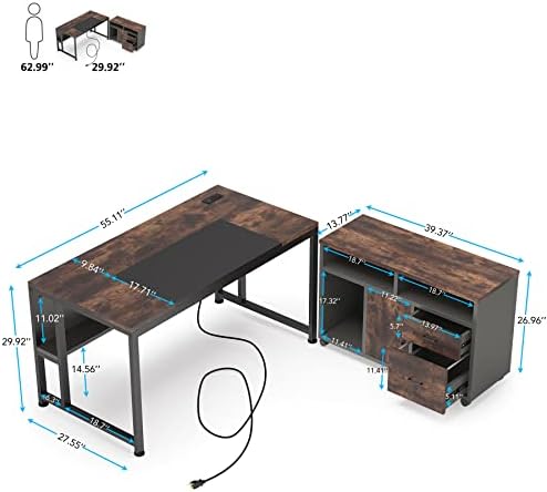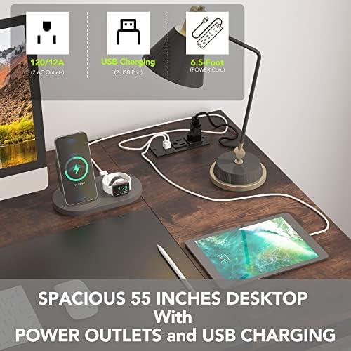 [55″ Black &rustic Office Desks with power outlet ]-55”×27″, provide ample &wide space for dual monitors, the underneath leg distance is 51.2″, plenty of leg room for tall people . open shelf under-desk for storage and organization.Features built-in power strip with 2 outlets and 2 USB ports, which brings a lot of convenience for charging mobile phones, gaming gear or others. 6.5ft extended cord is long enough for plugging in power.