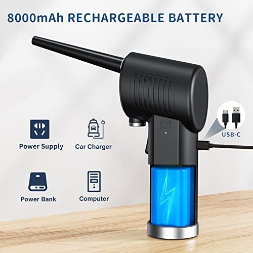 This cordless air duster (2nd) is upgraded with an 8000mAh battery. Uses USB-C charging port. The power is upgraded to 75W, and the wind power is enhanced much beyond. Still able to work continuously for about 30 minutes.