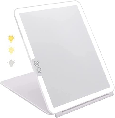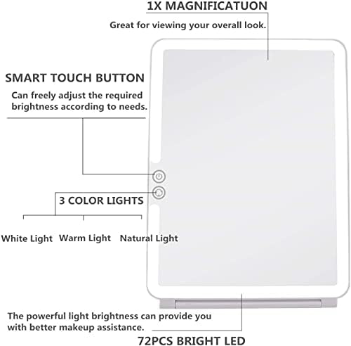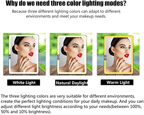 【Adjustable 3 Color Lights】Lighted mirror makeup provides 3 color lights, white light, natural light, and warm light.Long press the on/off to adjust the brightness of the light, is so bright to cover all corners of your face but also soft enough to protect your eyes from harsh fluorescent.Allows your face is clearly visible; Can be used for makeup, skin care, shaving, etc.