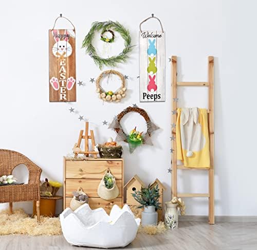 Reversible Spring or Easter Welcome Sign Set of 2- Welcome guests with a warm and rustic look that accents any design color scheme like neutral tones to vibrant paints and stains. Includes 4 designs: Hello Spring with flowers on one side and Happy Easter with bunny face and feet on the other side, Welcome with flowers on one side and Welcome Peeps with 3 bunnies and pompom tails on the other side on a wooden slats background. Effortlessly blends in well with wood, metal and glass fixtures and surfaces to create a wonderful welcoming atmosphere. If you are looking for an eye catching wooden wall art sculpture that can be used as either modern or rustic wall art, then you have found it with this beautifully designed home decal! This 2 piece works great alone, or as a set with other multiple matching Easter wall decor. The perfect wedding gift ideas from this wall art fits any home design. An important accessory for home furnishing living and eating dining areas. Makes the perfect house warming gift. Instead of using posters or prints on walls, make this unique door decor piece the center focused artistic appeal of your front door, porch door or anywhere you like. A simple yet creative approach to a spring decor wall art that’s perfect for a home, patio, restaurant, coffee shop, cafe or diner. Wall art piece measures approximately 17″ H x 6″ W. The Easter and spring decorative wooden wall decal is made out of high quality lightweight painted wood that’s made to last from year to year. Comes attached with a jute hanging string which can be easily hung up on any surface.