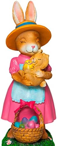 Bunny for Easter Decor – charming 11.8×4.8×5.2 bunny figurine with baby and Easter basket full of pastel easter eggs is handcrafted from high-quality resin materials.