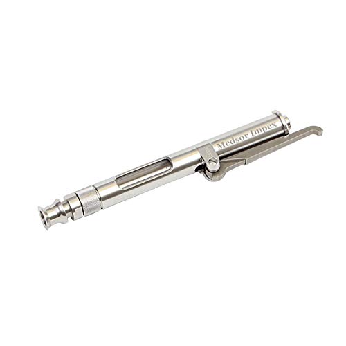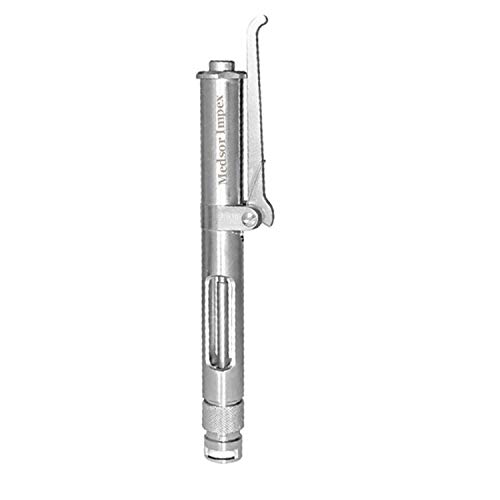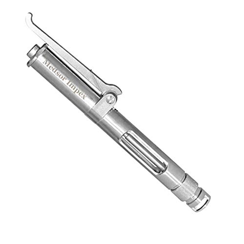 Derma jet B1 is a simple instrument for intradermal infiltration of local anesthetics, steroids, vaccines, etc. Dermojet is versatile in applications, including minor surgical work in general anesthesia, vaccination, dermatology, etc. All applications related to intradermal infiltration of soluble drugs only since crystals in suspension will brock the jet’s orifice. It is used for alopecia treatment. Specifications: