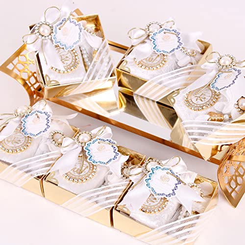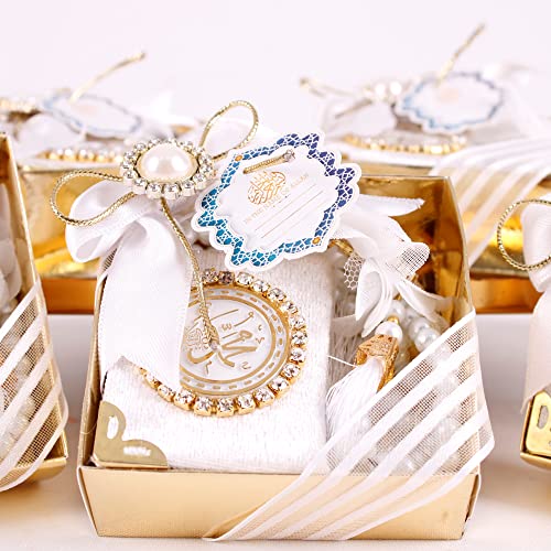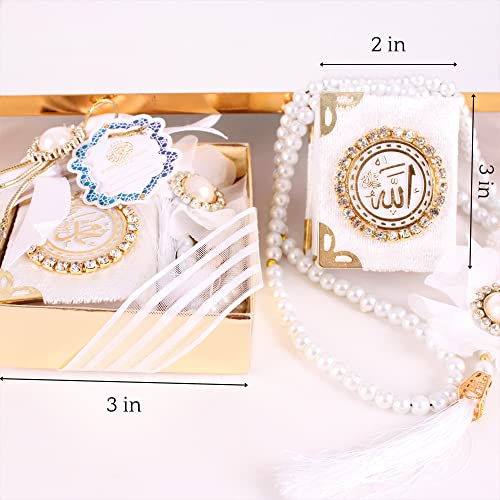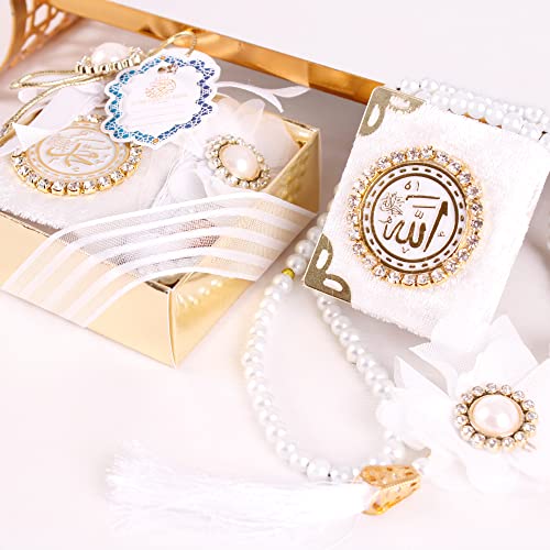 Content: Pack of 6 Velvet Mini Quran Pearl Prayer Beads Gift Set (Gold Gift Box included)