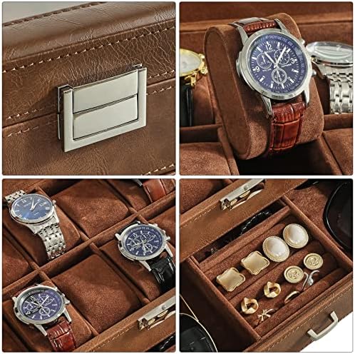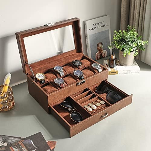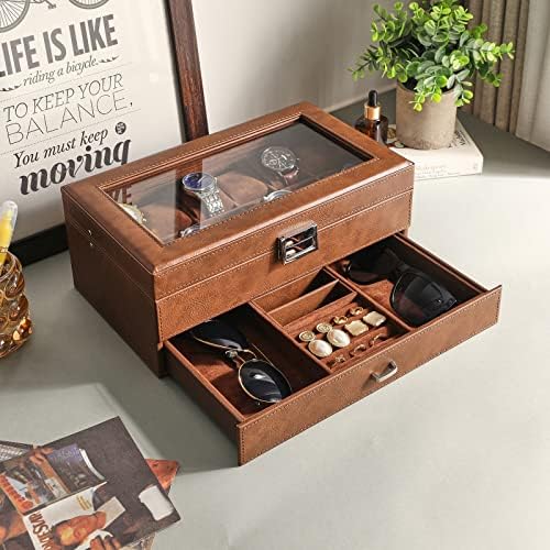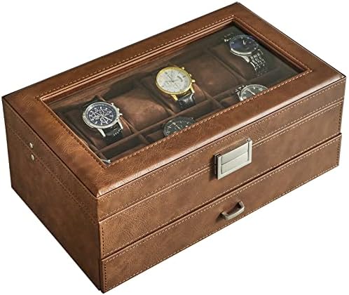 WATCH & JEWELRY CASE: Double Layer design.The first layer offers 12 slots,It has enough room to hold large watches. As for the pull out drawer, the spaces on the side are large enough to hold extra bands, glasses.The section in the middle is useful for smaller rings, bracelet and similar jewelry;