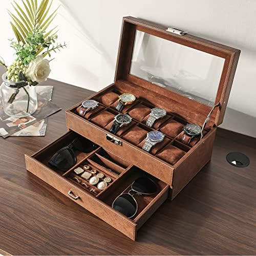 IBUYKE Watch Box 12 Slots PU Leather Watch Case for Men – Jewelry Display Drawer Case with Glass Top,Smooth Velvet Lining UJWB001Z