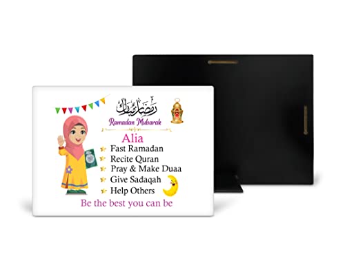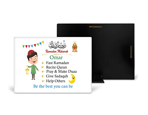 Beautiful wood sign celebrating Ramadan. It adds warmth and elegance to this tasteful decoration. Would nicely sit on a fireplace, a desk, or against a wall. Comes with a stand. The design is printed on the sign. It can be custom made for other occasions. Dimensions: 8″ x 10″