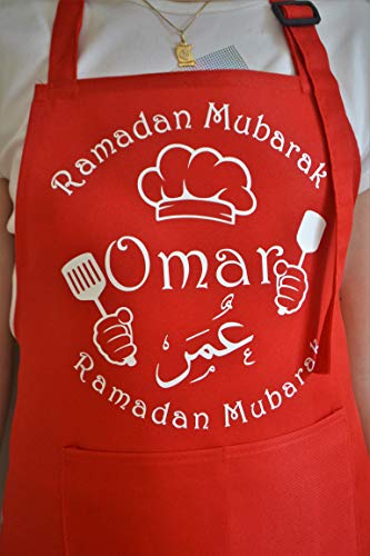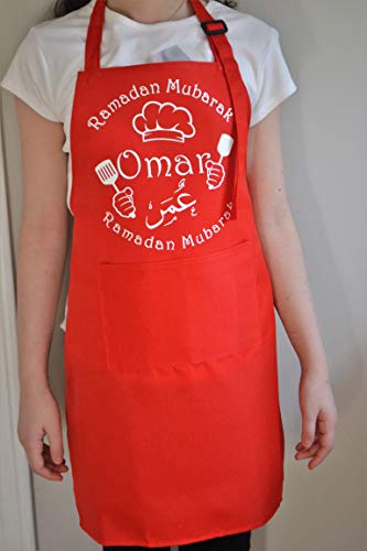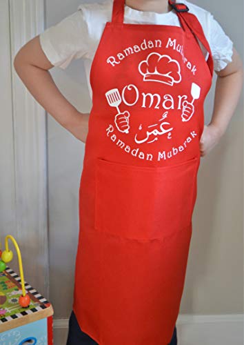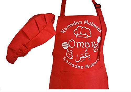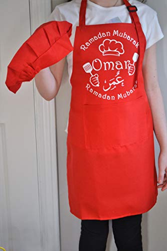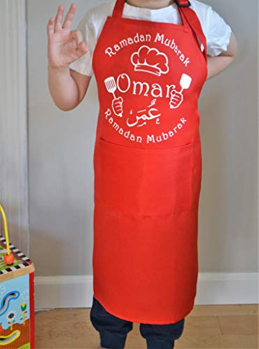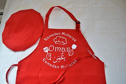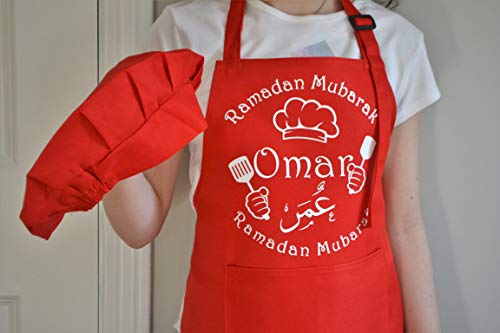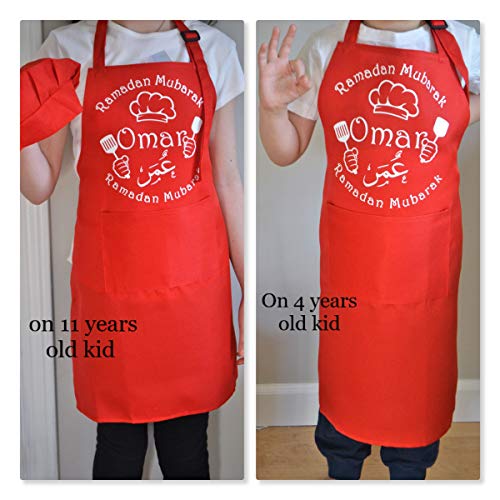 This is a colorful and beautiful personalized apron and a matching hat for Ramadan, Eid, Birthday and many more occasions. It would be a nice gift for your kids during the whole month of Ramadan. It can be personalized with names and can be customized with any text you choose for many occasions. The aprons come in 3 colors: Red, Green and Blue. Please make sure to leave your customization and/or personalization in the box, if you wish to add a name or short note. It fits kids from 4 to 12 years old as shown in the pictures. The apron is adjustable and have 2 front pockets. It is quite lovely to have family and friends wear matching aprons as they cook Iftar together.