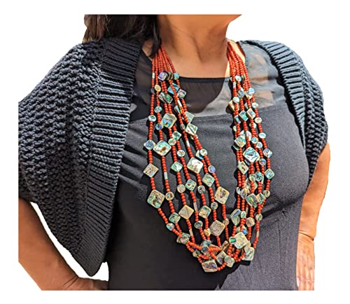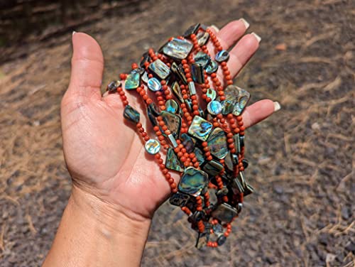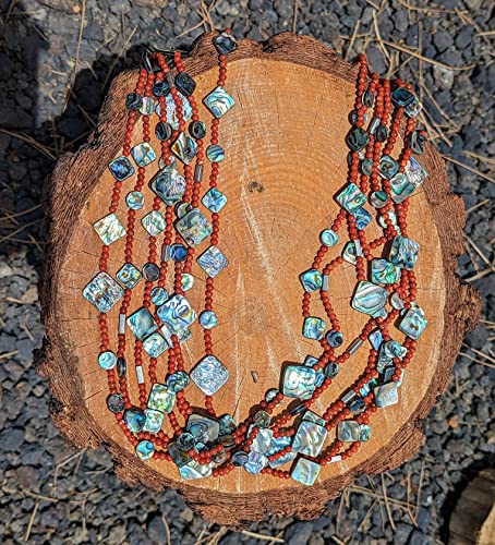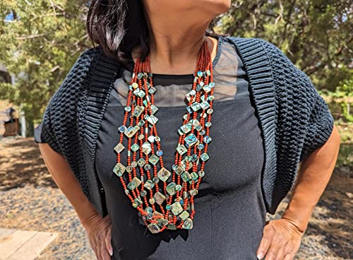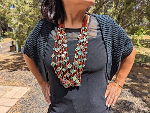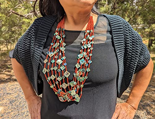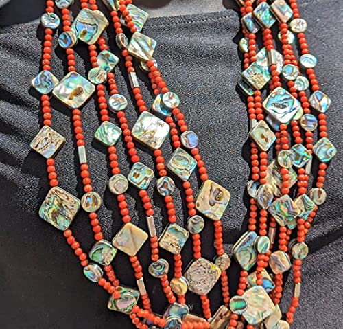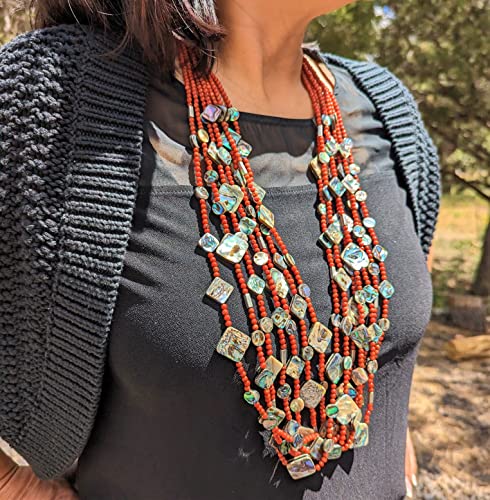 This is a super gorgeous one-of-a-kind handmade Santo Domingo necklace with 7 strands of beautifully crafted natural Mediterranean coral & abalone beads. It took countless hours to create this masterpiece, fit for a museum collection. Elegant and beautiful Southwestern collectible quality jewelry. Outstanding workmanship. Colors are so vibrant and naturally coordinated. Handmade by Native artisan Judy Rosetta. Judy’s work has been featured in books and magazines highlighting Native American arts and culture.