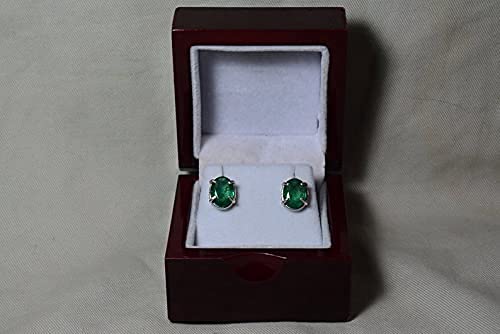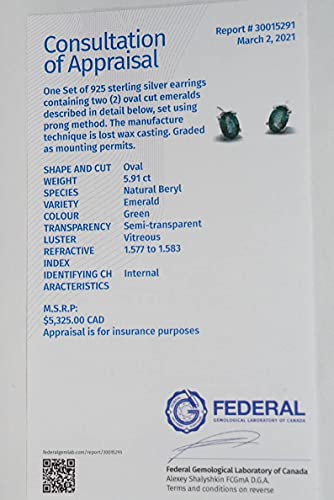 The earrings are described as follows: Shape And Cut: Oval Weight: 5.91 ct Species: Natural Beryl Variety: Emerald Color: Green Transparency: Semi-transparent Lustre: Vitreous Refractive Index: 1.577-1.583 Identifying Characteristics: Internal M.S.R.P: $5,325.00 CAD.