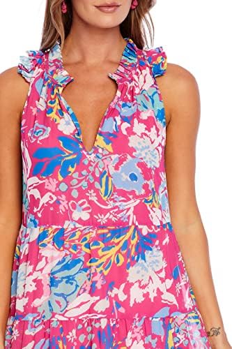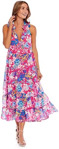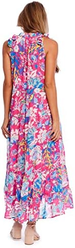 Lined poly chiffon sleeveless maxi dress features tiered bodice and ruffle details around neckline. Measures approximately 47 3/4″ from shoulder to hem on size small.