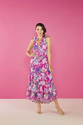 Lined poly chiffon sleeveless maxi dress features tiered bodice and ruffle details around neckline.