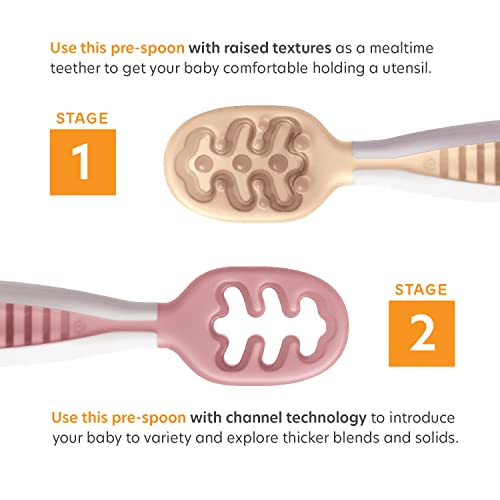EASY SELF-FEEDING FOR THE FIRST STAGE: Make the starting solids transition easier (and more fun!) for baby. Each set comes with a pre-spoon perfect for purees, doubling as a teether for sore gums, along with an open-channel spoon designed to grip soft solids. These spoons help teach the skills and motions needed to graduate to a traditional spoon, without requiring wrist rotation to use – a skill children typically don’t develop until 2 years old.