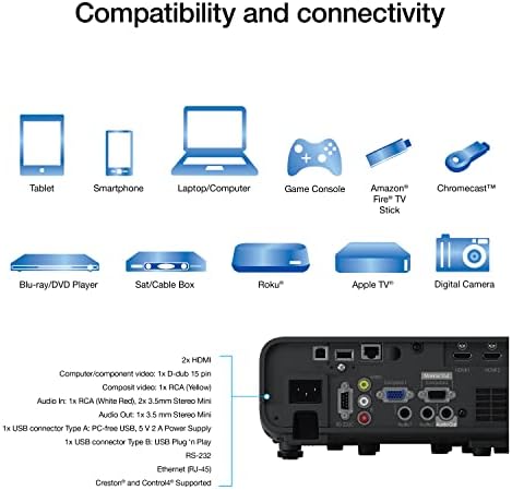 The perfect solution for the evolving workplace, the Pro EX11000 Full HD 1080p laser projector produces a bright and vibrant display designed to maximize visibility and engagement. Cultivate collaboration during Zoom meetings and video conferences with vivid, immersive images up to 300″—all while keeping the lights on. Experience amazing clarity with 4,600 lumens of color and white brightness1 plus, with the 20,000-hour laser light source2 there are no lamps to replace, ever. With Best-in-Class Color Brightness3 and a built-in 16 W speaker, the Pro EX11000 helps ensure that you won’t miss any of the important details. Offering a multitude of connectivity options, including two HDMI ports and a USB port to power popular streaming devices like Fire TV, Apple TV®, Roku, and Chromecast™4, the Pro EX11000 redefines versatility. With 3-chip 3LCD technology, experience remarkable color accuracy while maintaining color brightness. Featuring easy-to-use image adjustments, 1 – 1.6x optical zoom, auto vertical correction and more, you will be up and running in no time. Work better together with the Pro EX11000. 1. Color brightness (color light output) and white brightness (white light output) will vary depending on usage conditions. Color light output measured in accordance with IDMS 15.4; white light output measured in accordance with ISO 21118. | 2. No required maintenance for the light source for up to 20,000 hours. Approximate time until brightness decreases 50% from first usage. Measured by acceleration test assuming use of 0.04 – 0.20 mg/m3 of particulate matter. Time varies depending on usage conditions and environment. Replacement of parts other than the light source may be required in a shorter period. | 3. Brightness (Color Light Output) in brightest mode, measured by a third-party lab in accordance with IDMS 15.4. Top selling Epson 3LCD projectors versus comparable 1-chip DLP® projectors based on NPD sales data for January 2022 to December 2022. COLOR BRIGHTNESS WILL VARY BASED ON USAGE CONDITIONS. | 4. Requires wireless network connection of 5 Mbps or faster. Some apps require paid subscriptions.
