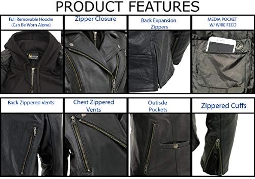 Outside Features Made of Premium Buffalo 1.2-1.3mm Thick Leather Front Zipper Closure Bronze Color Snap Button and Zipper Hardware Shoulder Snap Straps Zippered Cuffs with Webbing Classic Motorcycle Jacket Lapel Design with Snap Buttons Scuba Style Body Ventilation System: Keep Cool with the Zippered Chest Vest and Zippered Back Vents for Maximum Air Flow 2 Lower Zippered Hand Pockets 1 Small Snap Button Pocket Lower Back-Hip Expansion Zippers for Added Comfort Action Back Shoulder Panel for Added Flexibility Genuine YKK Zippers – Known for Longevity and Durability Comfort, Performance and Style by Xelement Bike Gear Always Going the Extra Distance Inside Features Removable Interior Hoodie Liner That Can Be Worn on Its Own Hoodie Features Front Zipper Closure with Draw String Interior Media Pocket with Wire Feed Inside Mesh Liner Built Inside Hanging Loop