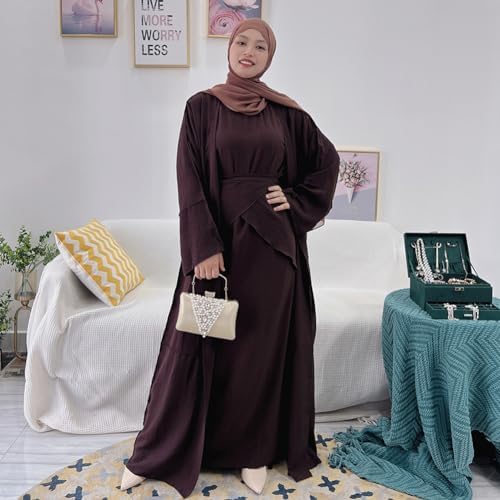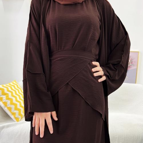Women’s Muslim Abaya Dress Three Pieces Set Islamic Prayer Robe Open Front Flowy Maxi Cardigan Dress