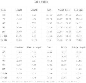 13-14Y:Bicep Length:12.9IN,Bust:37.0IN,Cuff:12.5IN,Length:22.8IN,Shoulder:15.4IN,Sleeve Length:6.5IN,Hip Size:37.8IN,Length:10.3IN,Thigh:23.9IN,Waist Size:25.2-37.0IN
