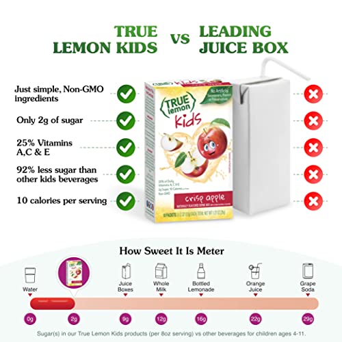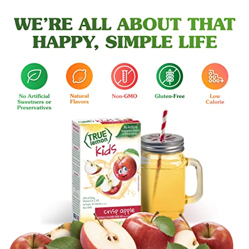LOW SUGAR: True Lemon Kids Crisp Apple is full of delicious flavor that kids love: juicy apple so this kids drink mix makes it easy to keep your children deliciously hydrated. And, with only 2 grams of sugar per serving, True Lemon Kids has 92% less sugar than leading children beverages like juice and soda!